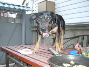 На следующий день после последнего звонка пригласил друзей к себе на шашлыки! Всё приготовили...составили на стол.Токо отвернулись пёс влез на стол и сожрал всё что успел, а что неуспел то испортил. Это он доедает кусок мяса